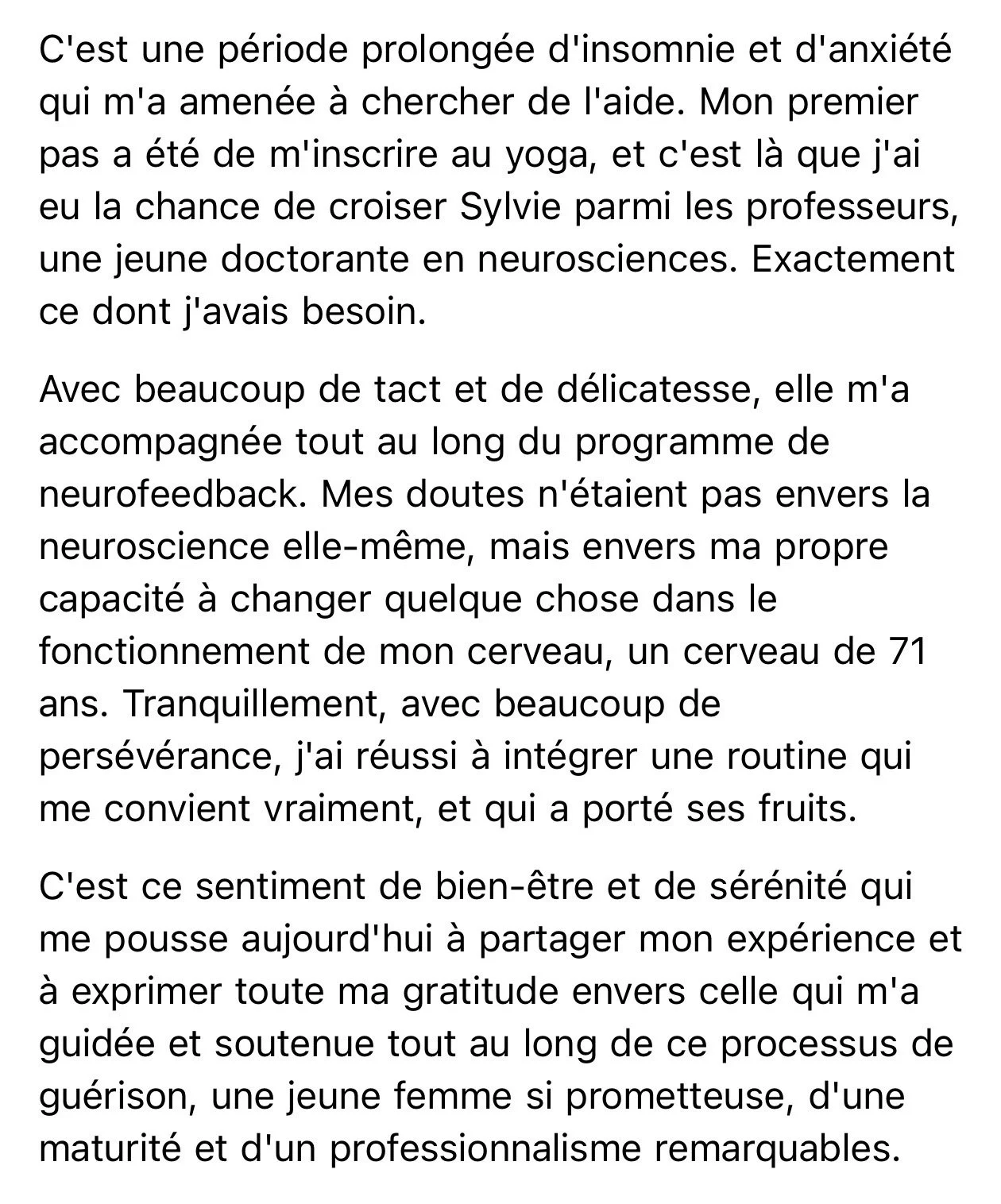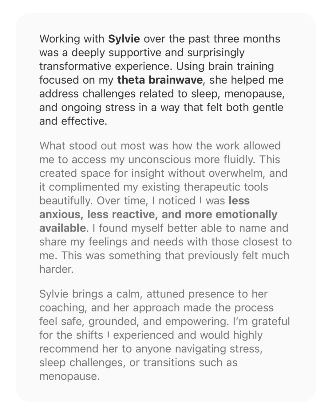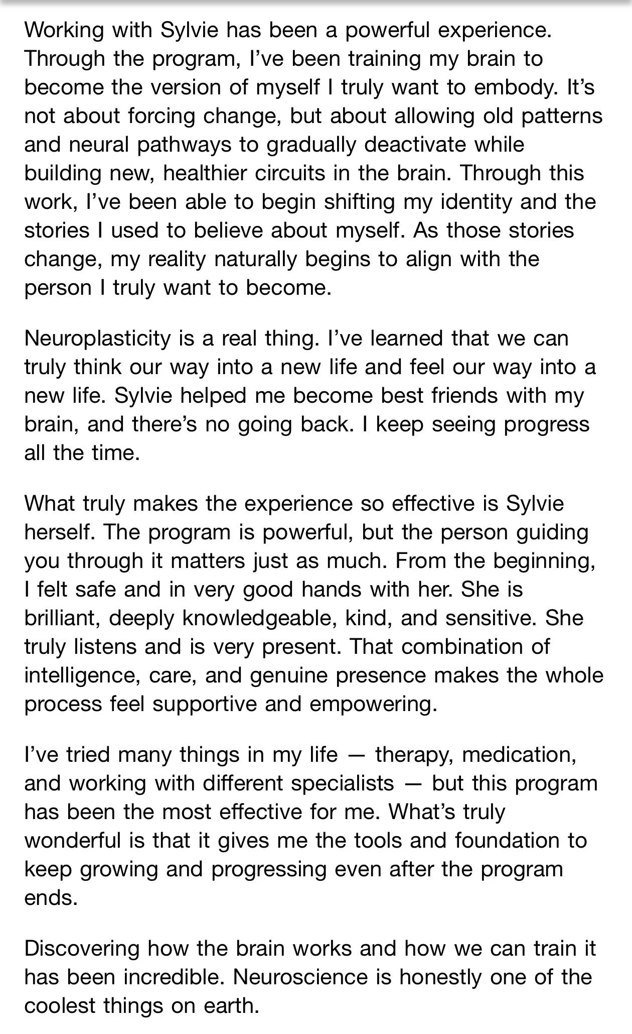 “Neuroplasticity is a real thing. I’ve learned that we can truly think our way into a new life and feel our way into a new life. Sylvie helped me become best friends with my brain, and there’s no going back. I keep seeing progress all the time.”